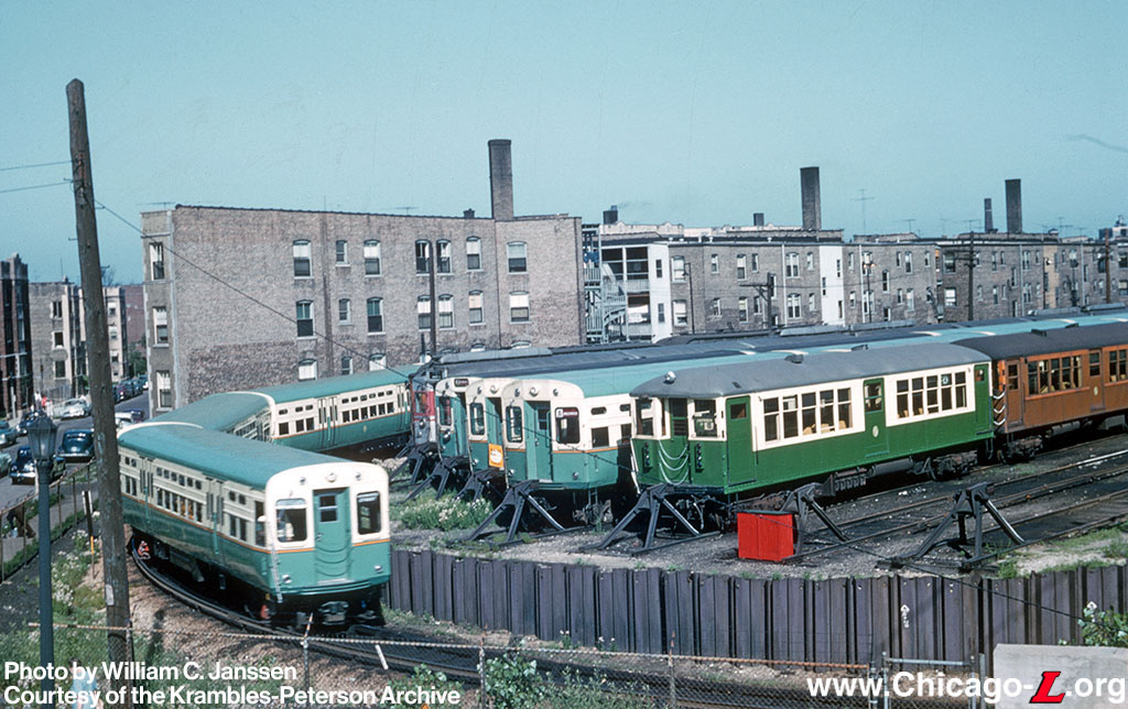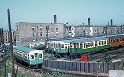 A train of 6000-series cars makes its way around the loop track in Howard Yard to turn around on July 4, 1954, passing a wide variety of passenger rolling stock laid up on the storage tracks, including (from left to right) a 5000-series car in its original paint scheme, various 6000-series cars of both the 6001-type and 6200-type configurations, and a train of 4000-series cars in both the then-new everglade green and cream livery and CRT-era orange and brown paint. For a larger view, click here. (Photo by William C. Janssen, courtesy of the Krambles-Peterson Archive) |