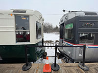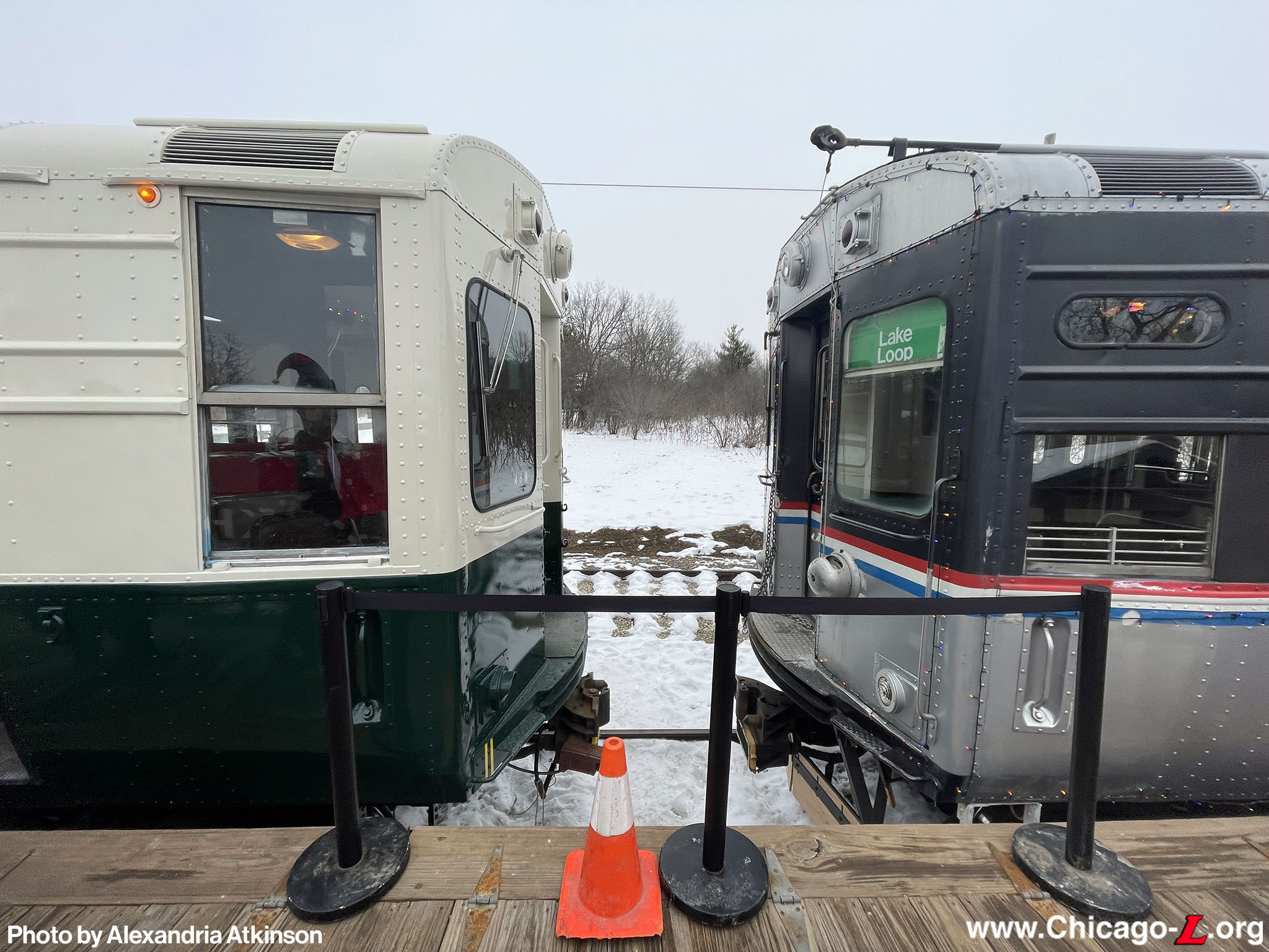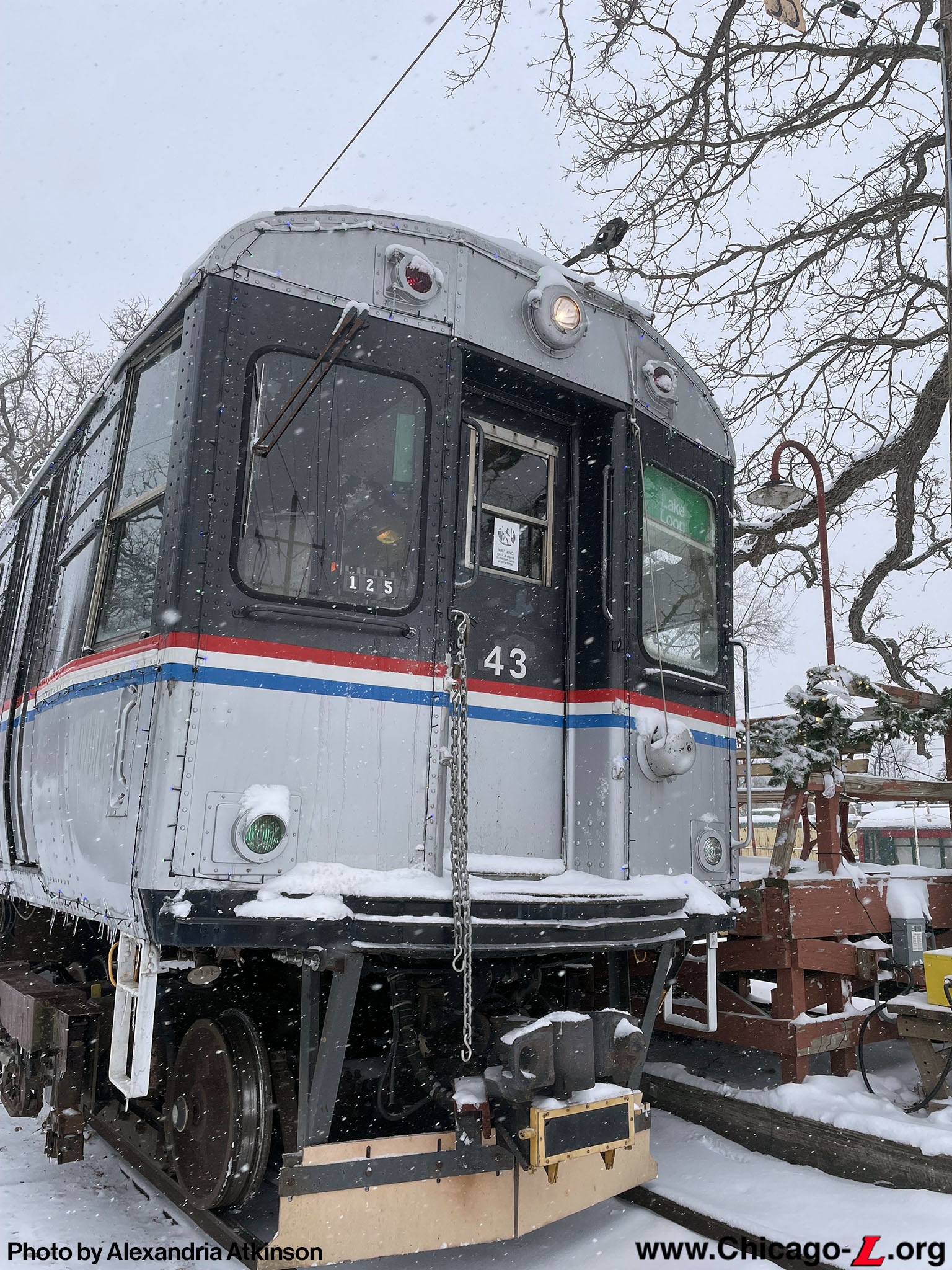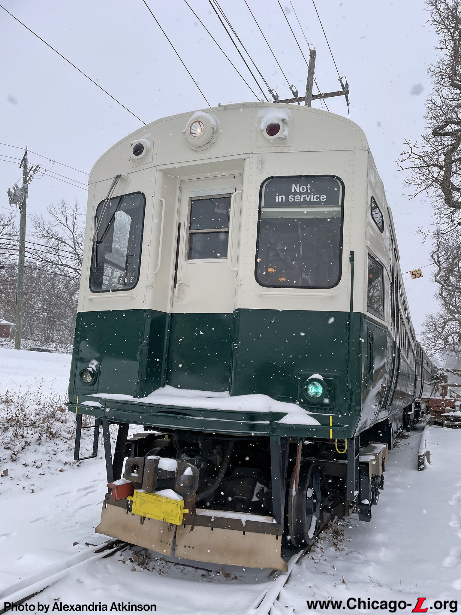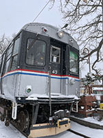 Another view of car 45, at the head end of a 3 car train of 1-50 series cars at the Fox River Trolley Museum on November 9, 2025 also in this train are cars 40 and 43. Built in 1959, it went to the East Troy Railroad Museum with sisters 28 and 25. In 2009, 28 and 35 were scrapped, and their parts went to the Illinois Railway Museum. Car 45 was sold to Fox River, where it was in service until 2013, when it began having traction motor issues. It was repainted in 2025, and is being used as a control trailer during the Santa's Trolley Express event. (Photo by Alexandria Atkinson)